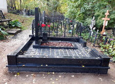 Когда подготовительные работы на территории могилы были завершены, мы принялись за укладку брусчатки на пескобетон, сама плитка была уложена вровень с облицованным гранитными плитами цоколем. Параллельно с этим мы подготовили основание для последующей установки надгробья.