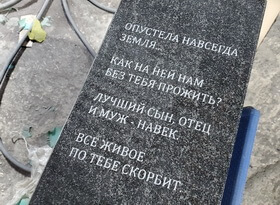 В ходе работы над данным заказом нам предстояло органично завершить оформление место захоронения, а именно установить у подножья памятника квадратную вазу из чёрного гранита, отличительной особенностью которой должна была стать выгравированная на лицевой стороне изделия эпитафия. Приняв заказ, мы, первым делом, создали трафарет надписи.